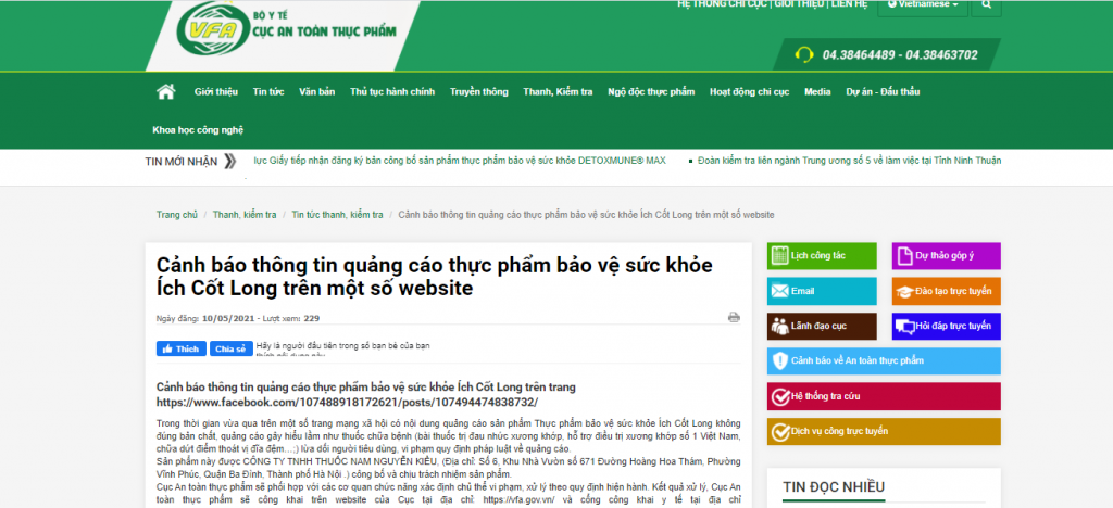 | Cảnh báo thông tin quảng cáo TPBVSK Ích Cốt Long trên một số website |