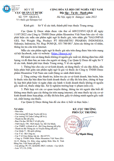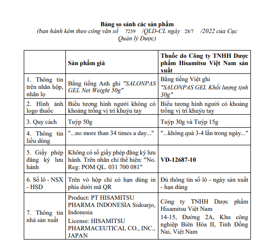 Vừa qua, sau khi nghi ngờ trên thị trường có các sản phẩm thuốc giảm đau giả Salonpas Gel, Công ty TNHH Dược phẩm Hisamitsu Việt Nam đã có văn thư số 609/22/HVC-QLD đề ngày 11/07/2022 gửi đến Cục Quản lý Dược để báo cáo về việc phát hiện các mẫu sản phẩm nghi ngờ là thuốc giả, trên nhãn ghi "SALONPAS GEL Net Weight 50g, Product: PT HISAMITSU PHARMA INDONESIA Sidoarjo, Indonesia, No. Reg: POM QL. 031 700 081", kèm các thông tin về nhãn, thông tin tra cứu trên Internet.