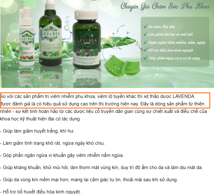 Hay như tại đường link https://www.24h.com.vn/tin-tuc-suc-khoe/lavenda-giup-ho-tro-dieu-tri-viem-phu-khoa-keo-dai-tra-lai-su-tu-tin-cho-phai-dep-c683a1251995.html, có so sánh TPBVSK Lavenda Plus có hiệu quả sử dụng cao so với các sản phẩm trị viêm nhiễm phụ khoa khác, trong khi đây chỉ là TPBVSK và không thể “trị” được bất kỳ triệu chứng nào.