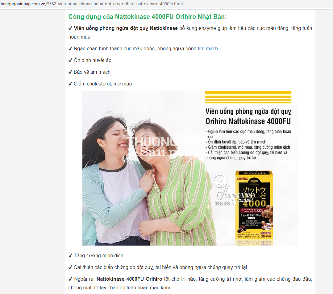 Mặc dù đã bị cơ quan chức năng "tuýt còi" nhưng theo khảo sát của Phóng viên ngày 26/5, sản phẩm thực phẩm bảo vệ sức khỏe Orihiro Nattokinase 4000, 60 capsules vẫn đang được https://orihiro.vn/product/vien-uong-ho-tro-dieu-tri-dot-quy-4000-fu-orihiro-60-vien/ quảng cáo với hàng loạt công dụng: “Ngăn ngừa sự hình thành cục máu đông, làm tan cục máu đông, thúc đẩy lưu thông máu lên não; Phòng ngừa tắc nghẽn mạch máu não gây bệnh tai biến, đột quỵ…