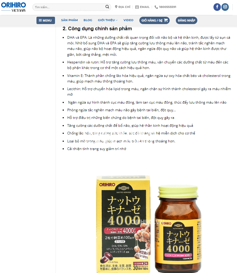 Còn tại https://www.hangngoainhap.com.vn/3532-vien-uong-phong-ngua-dot-quy-orihiro-nattokinase-4000fu.html sản phẩm Orihiro Nattokinase 4000, 60 capsules được quảng cáo với công dụng: Hỗ trợ điều trị những biến chứng do bệnh tai biến, đột quỵ gây ra; Tăng cường các dưỡng chất để bổ não, giúp hệ thần kinh hoạt động hiệu quả; Chống lão hóa, tăng cường sức khỏe, sức đề kháng và hệ miễn dịch cho cơ thể; Loại bỏ mỡ trong máu, giúp mạch máu trở nên thông thoáng hơn; Cải thiện tình trạng suy giảm trí nhớ;…”