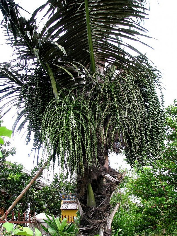 Cụm hoa hình bông mo to, dài 0,9-1,2m, chia nhiều nhánh cong xuống. Hoa đực hình nón có 70-80 nhị; hoa cái có 3 lá đài tồn tại ở quả.