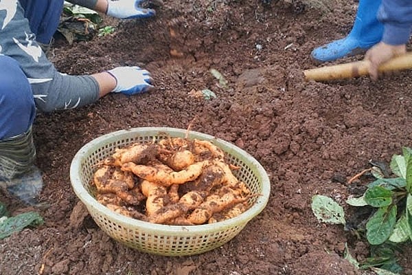 Sau khi trồng khoảng 6 tháng rưỡi là có thể thu hoạch. Mỗi năm có thể thu hoạch đến hai vụ vào các tháng 2 - 3 và 8 - 9. Người ta khuyên nên chọn ngày nắng ráo để đào củ.