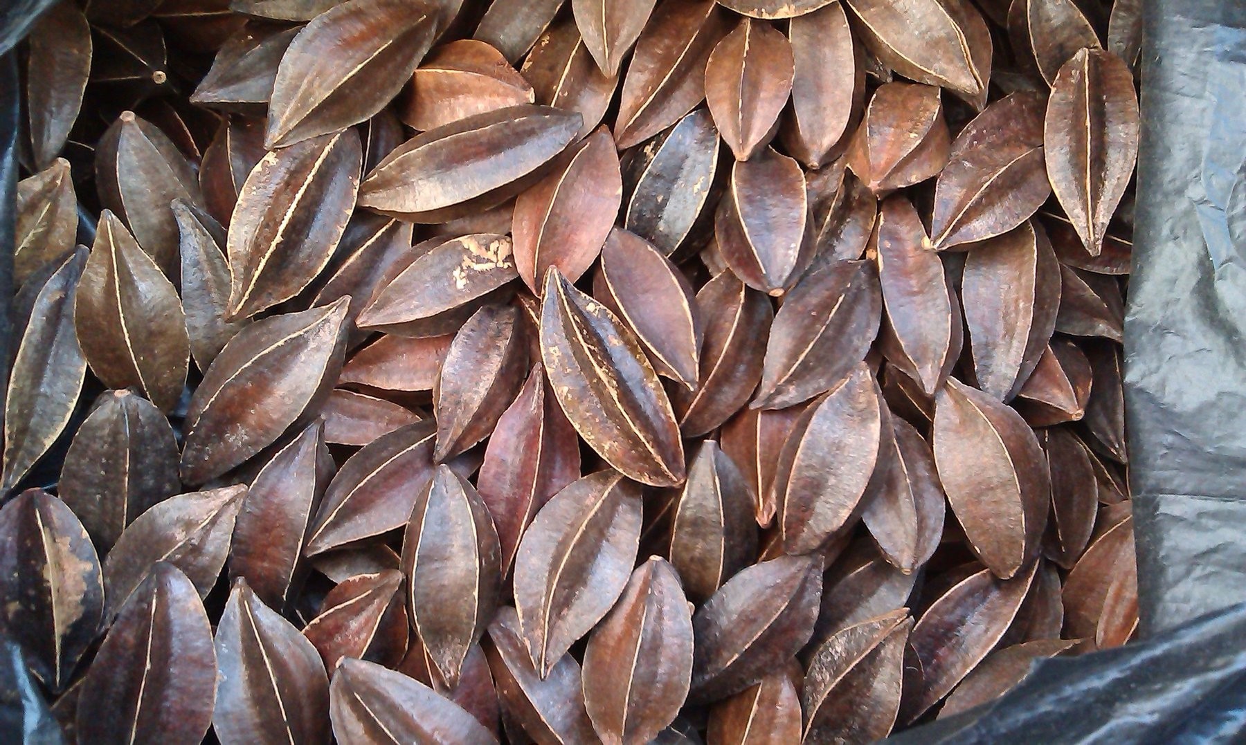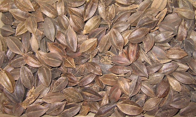 Trong quả chứa một hạt hình thoi, vỏ màu nâu sẫm, dễ bóc, phần nhân bên trong mềm có màu vàng, vị ngọt, không mùi.