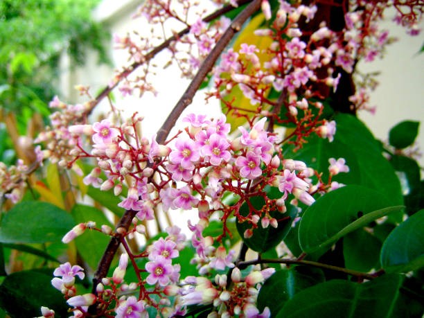 Hoa khế mọc thành cụm, hoa nhỏ hình cuông màu đỏ tím, mỗi hoa rộng khoảng 5-6 mm, có 5 cánh.