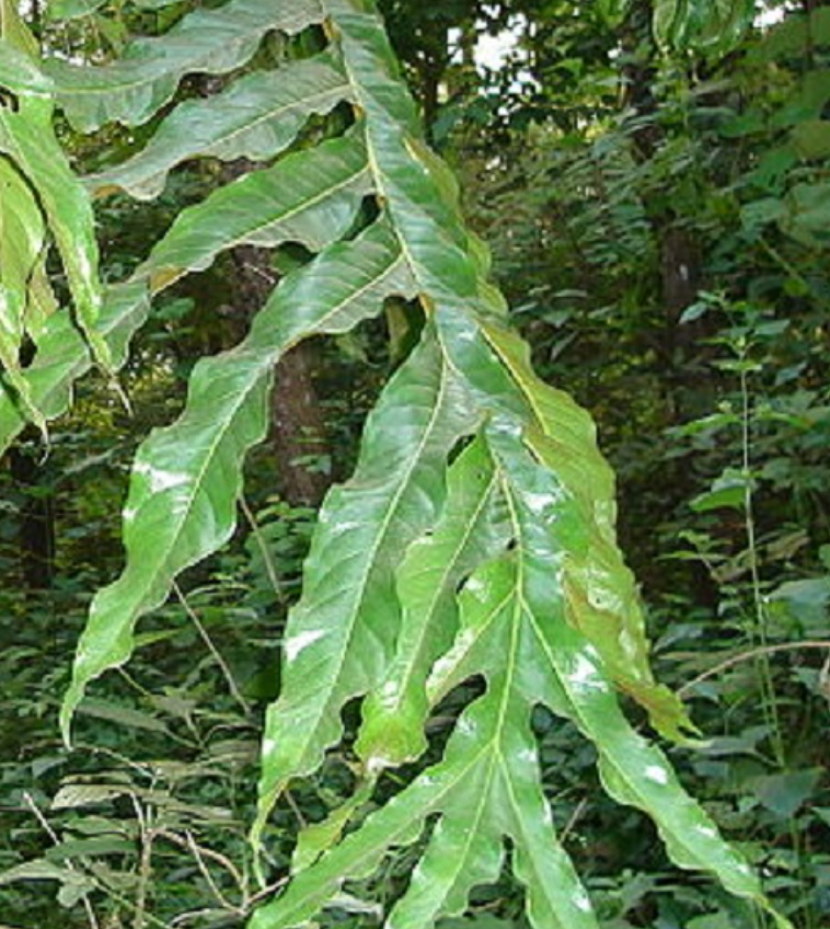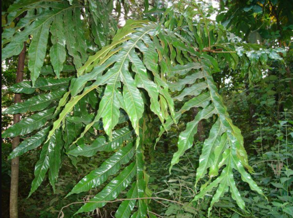 Cuống lá cứng, dài 40-80cm, rộng 20-40cm, xẻ sâu tạo thành hình gần bầu dục, mỗi lá xẻ từ 3-9 thùy dạng trứng, mép lá có thể nguyên hay có hình gợn sóng.