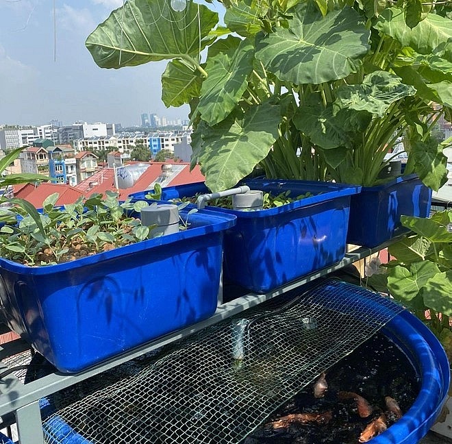 | Khu vườn trồng rau, nuôi cá trên sân thượng ở Hà Nội của chàng kỹ sư Lê Đăng Thịnh. |