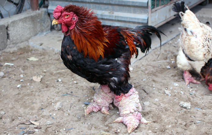| Mới chỉ 13 tháng tuổi nhưng cân nặng của "ông vua" này đạt hơn 6kg. Giống gà này thuộc giống chân tròn, vảy thịt - một trong những giống gà được khách mua ưa chuộng nhất để làm quà biếu Tết. Con gà này đạt được những tiêu chí khắt khe nhất trong bảng đánh giá gà Đông Tảo |