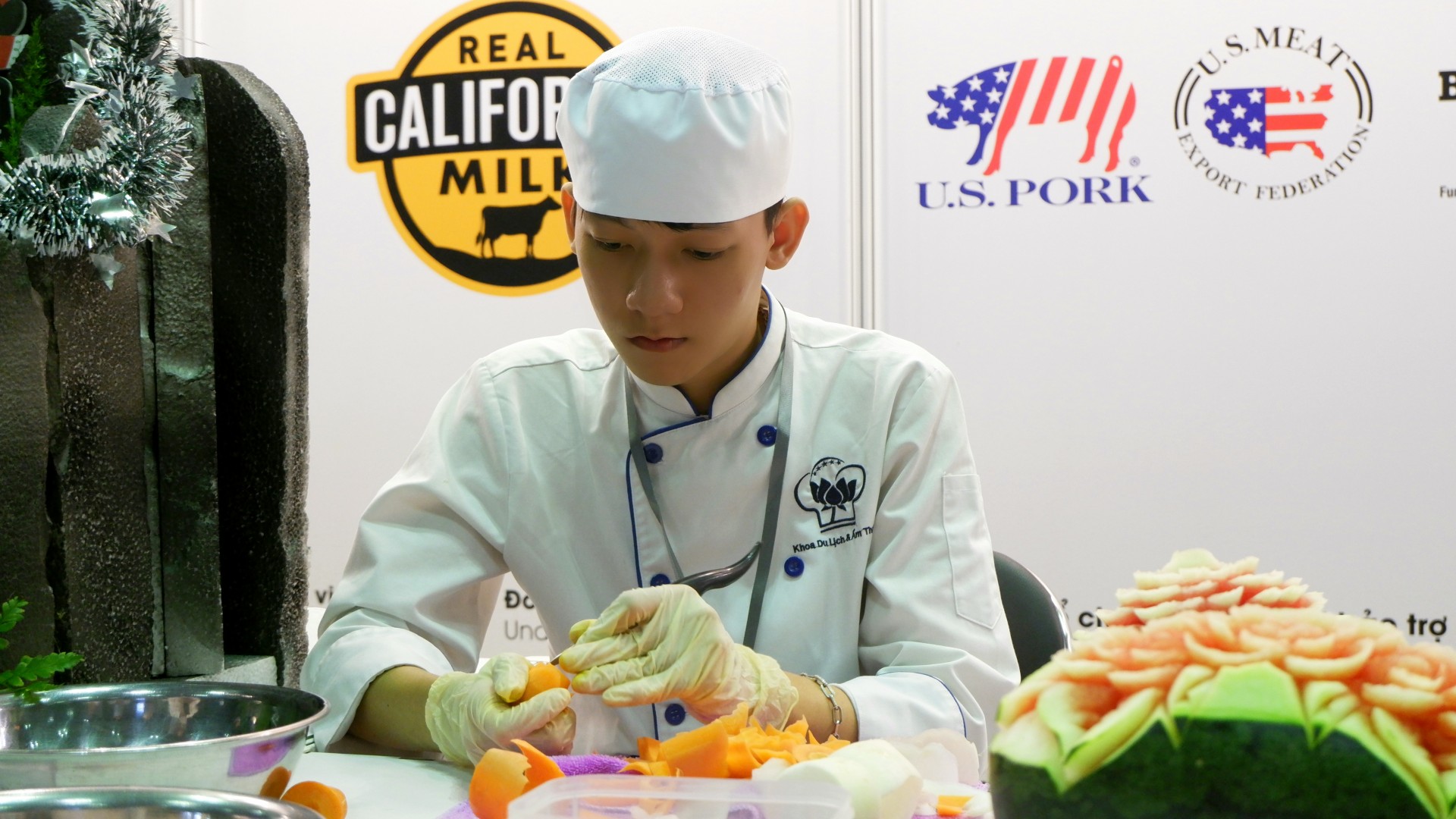 | Một trong những đầu bếp thể hiện tài năng điêu khắc củ quả tại triển lãm Food & Hotel Vietnam 2022 |