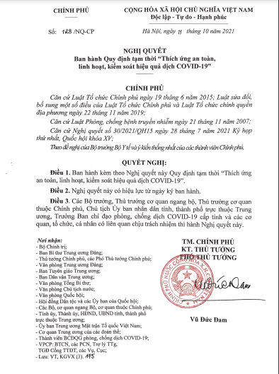 | Nghị quyết số 128/NQ-CP của Chính phủ quy định tạm thời "Thích ứng an toàn, linh hoạt, kiểm soát hiệu quả dịch COVID-19" |