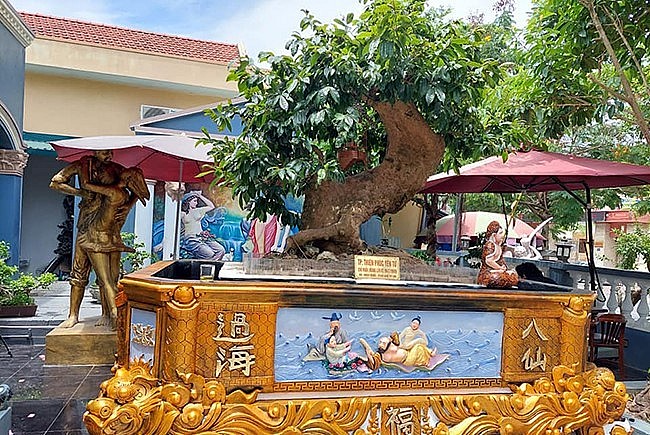 | Đặc biệt, cây mai cổ thụ này được rong một chiếc chậu dát vàng, đặt cho một cái tên là "Thiên Phúc Yên Tử". |