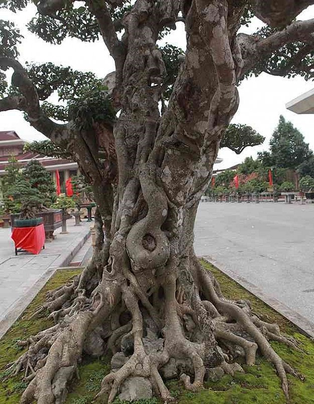 | Sanh bonsai cổ thụ này có rễ nâu óng, thân cây mốc chứng tỏ cây đã nhiều năm tuổi. |