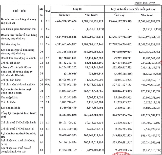 Chi phí tài chính giảm 7% xuống 78,18 tỷ đồng. Chi phí quản lý doanh nghiệp giảm 7% xuống 135,8 tỷ đồng và chi phí bán hàng tăng 45% lên 16,5 tỷ đồng.