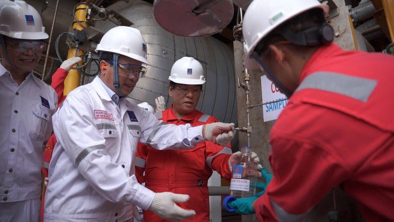 | Chủ tịch HĐTV PVN Hoàng Quốc Vượng nhận dầu mẫu trên giàn Hải Thạch |