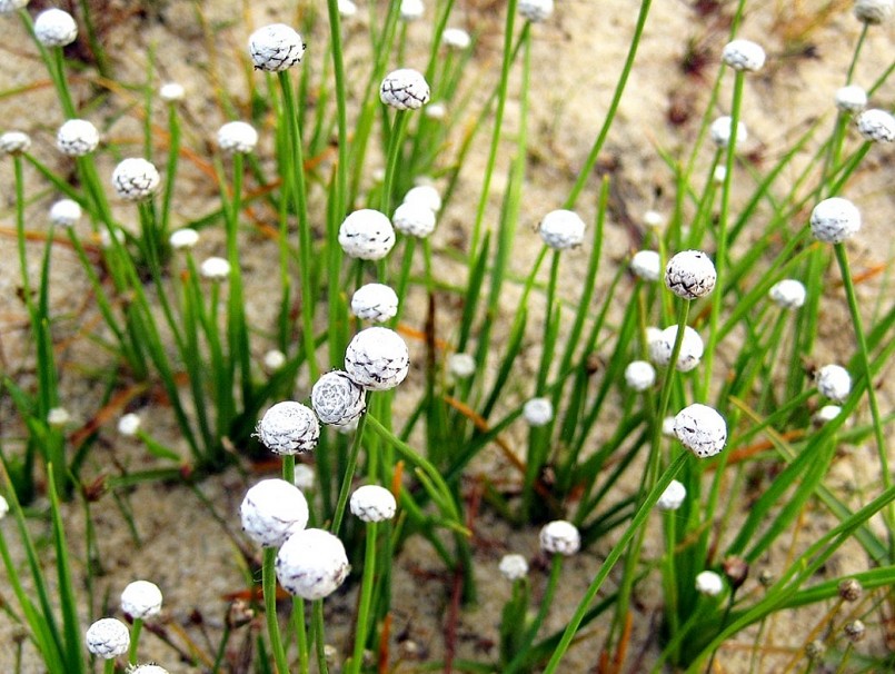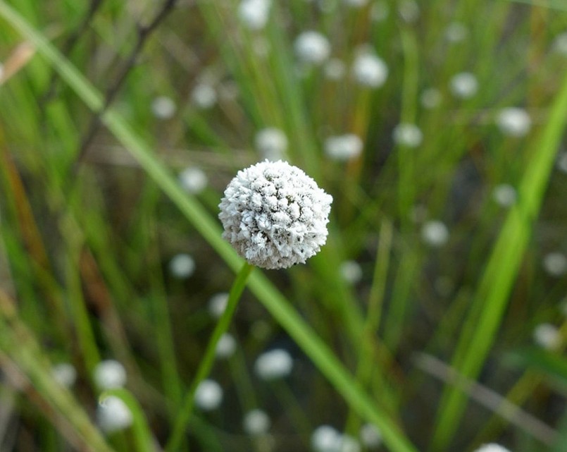 Hoa cỏ dùi trống mọc thành cụm, cuống hoa dài từ 10 - 50cm chùm hoa của cây tròn dẹt, đầu hoa có hình trứng hay hình trụ, đường kính 4-6 mm, có thể lên đến hơn 6mm. Mặt trên của cụm hoa có màu trắng xám, nếu cọ xát vào chúng sẽ thấy xuất hiện nhiều bao phấn màu đen. Lá bắc xếp chồng dưới cụm hoa một cách dày đặc, có nhiều lông bên trên, màu lục nhạt, bóng láng.