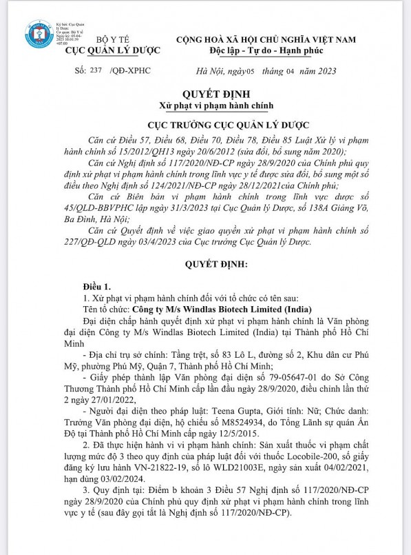 Công ty M/s Windlas Biotech Limited (India) bị xử phạt do đã thực hiện hành vi vi phạm hành chính: sản xuất thuốc vi phạm chất lượng mức độ 3 theo quy định của pháp luật đối với thuốc Locobile-200, số giấy đăng ký lưu hành VN-21822-19, số lô WLD21003E, ngày sản xuất 4.2.2021, hạn dùng 3.2.2024. Mức phạt tiền là 50 triệu đồng.