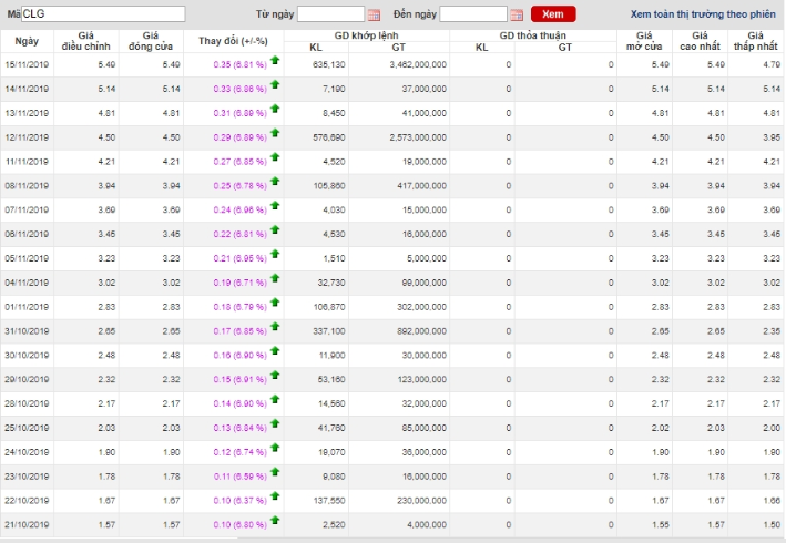 Kết thúc phiên giao dịch ngày 15/11 cổ phiếu CLG tăng kịch biên độ lên mức 5.490 đồng/cổ phiếu. Thanh khoản bình quân ở giai đoạn này đạt 75.000 đơn vị/phiên, đột biến so với mức 10.000 đơn vị/phiên như trước đó.