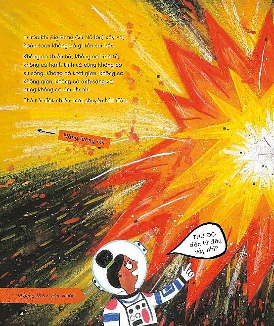 Sau khi tìm hiểu về Trái Đất thì các em lại được mở rộng kiến thức qua cuốn Câu chuyện về vũ trụ kì diệu. Trước khi Vụ Nổ lớn (BigBang) xảy ra, không có gì tồn tại. Không có thiên hà, không có tinh tú, không có hành tinh và không có sự sống... Thế rồi đột nhiên 13,8 tỉ năm trước, một điểm bé tí xíu, nóng bỏng xuất hiện và ngay lập tức phình to ra. Mọi thứ trong điểm tí xíu ấy bung ra dữ dội bằng một lực đến từ năng lượng tối tạo nên Big Bang. Từ đó vũ trụ được hình thành.