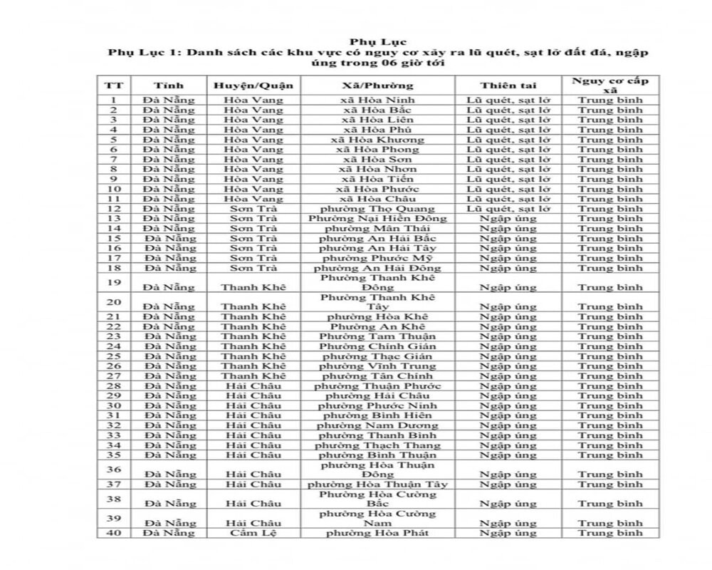 Các xã Hoà Ninh, Hoà Bắc, Hoà Liên, Hoà Phú, Hoà Khương, Hoà Phong, Hoà Sơn, Hoà Nhơn, Hoà Tiến, Hoà Phước, Hoà Châu (huyện Hoà Vang) và phường Thọ Quang (quận Sơn Trà) có nguy cơ xảy ra lũ quét trên các sông, suối nhỏ và sạt lở trên sườn dốc.