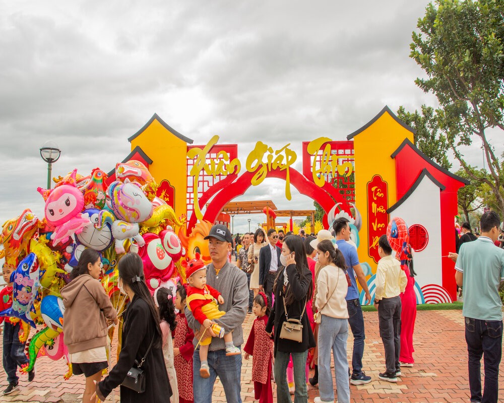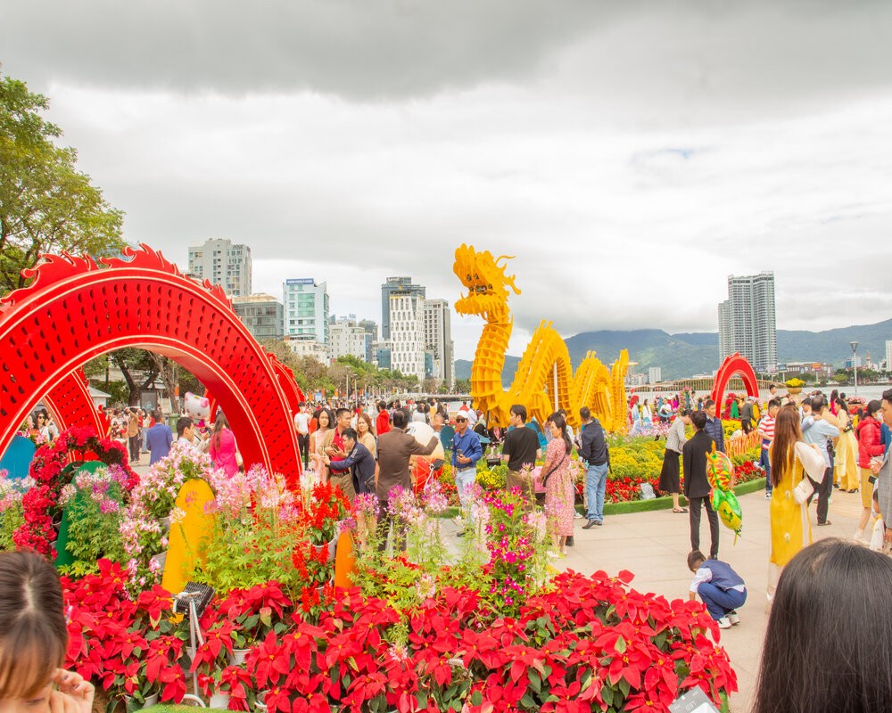 Sáng ngày 10/2 (tức ngày Mùng 1 Tết Giáp Thìn), hàng ngàn người dân và du khách đổ về đường hoa Tết Đà Nẵng để tham quan, chụp ảnh. Các linh vật rồng và tiểu cảnh là điểm nhấn để thu hút mọi người đến check-in.