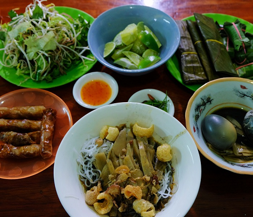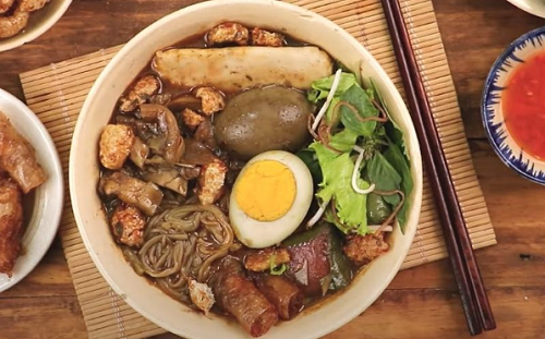 Ngoài ra chủ tiệm cũng thường dọn thêm rau sống, bánh phồng tôm, chả ram, chả, nem chua...để thực khách có thể ăn thêm. Để món ăn có độ bùi béo, thơm ngon, bạn nên thưởng thức kèm trứng vịt luộc được nấu cùng nước dùng. Quả trứng "nhuộm" màu đen ngòm, thoang thoảng vị cua lên men khá lạ.