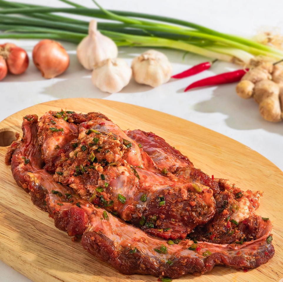 Chị em cho thịt vào âu lớn, ướp cùng 2 thìa canh dầu hào, 1 thìa canh tương ớt, 1 thìa canh dầu màu điều, 1/2 thìa canh nước mắm, 1/2 thìa canh sữa đặc, 1/2 thìa canh đường, 1 thìa cà phê mật ong cùng hành tỏi nghệ giã nhỏ, hạt tiêu, ớt bột, hạt dổi và mắc khén. Sau đó chị em trộn đều hỗn hợp và bọc màng bọc thực phẩm, để ngăn mát tủ lạnh ướp tối thiểu 1,5 giờ cho thấm vị, để càng lâu thì món nướng càng ngon.