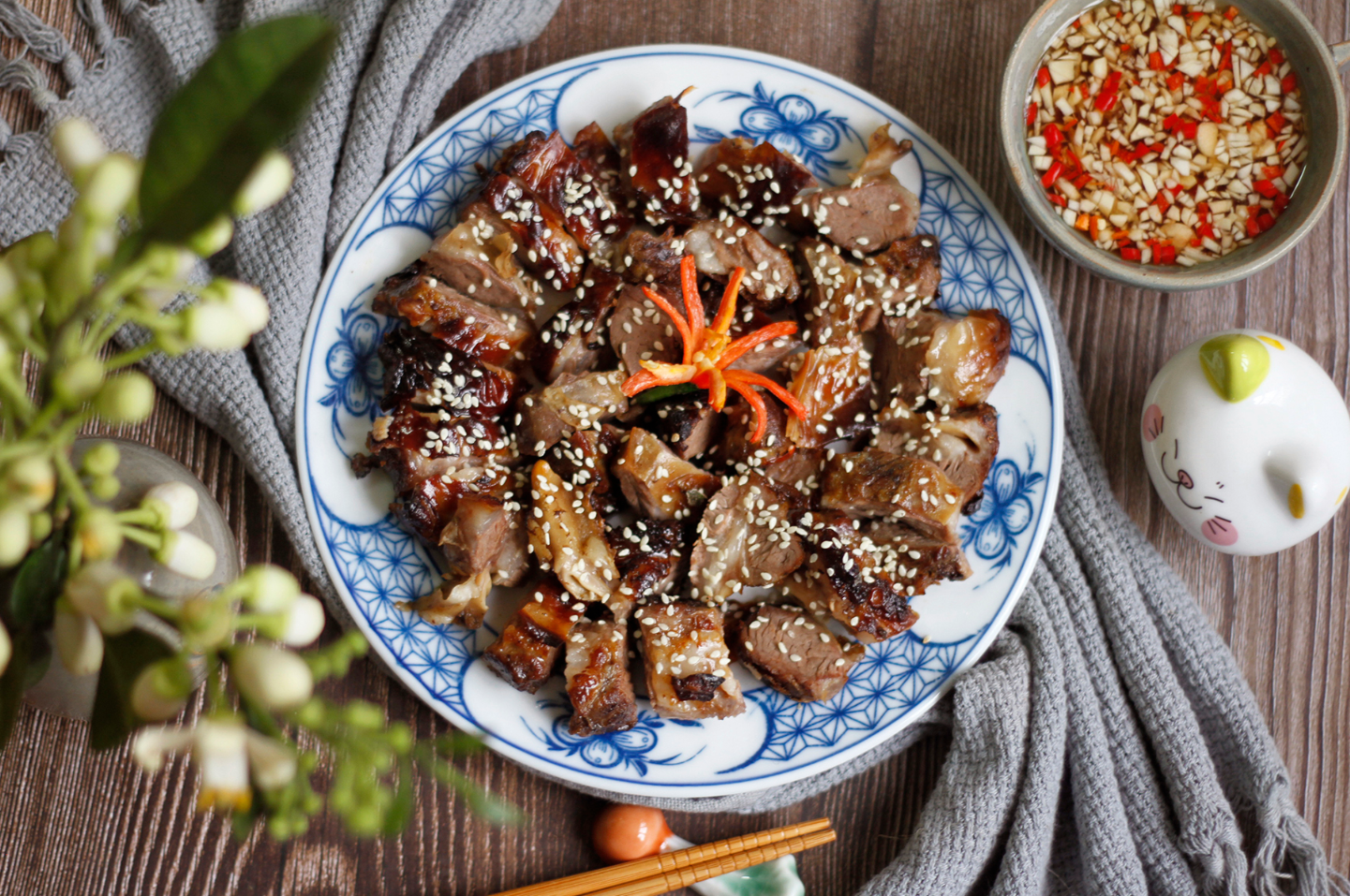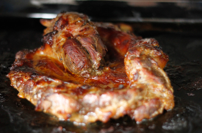 Nếu có than hoa nướng là ngon nhất, nếu không chị em dùng lò nướng, nồi chiên không dầu. Khi nướng lần đầu làm nóng lò trước 10 phút ở 180 độ, gói thịt vào giấy bạc nướng 20 phút để thịt chín mà không bị khô. Sau đó, mở giấy bạc, phết thêm mật ong và dầu màu điều nướng lần hai để thịt lên màu đẹp mắt. Khi thịt chín vàng đều, óng màu nâu đỏ là được. Món ăn này ăn kèm với dưa chuột, rau sống và chấm với nước sốt cay vô cùng thơm ngon.