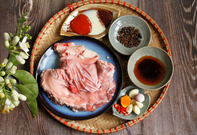 Theo đó chị em dùng muối hạt và chanh xát thịt dải lợn khử mùi, rửa sạch, thấm khô rồi ùng chày đập dập qua cho thịt mềm. Hành củ, tỏi, nghệ tươi giã nhỏ. Hạt tiêu, hạt mắc khén, hạt dổi rang thơm, giã dập.