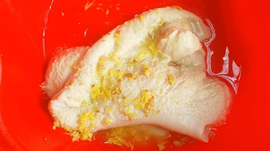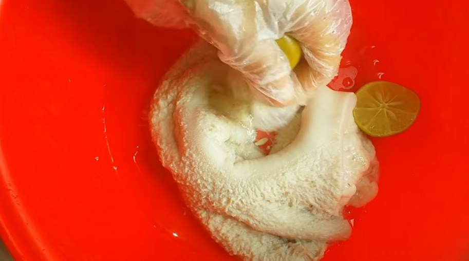Cuối cùng, vắt 2 trái chanh vào thau, tiếp tục bóp mạnh tay khoảng 3 - 5 phút rồi rửa sạch, chuẩn bị đem đi chế biến.