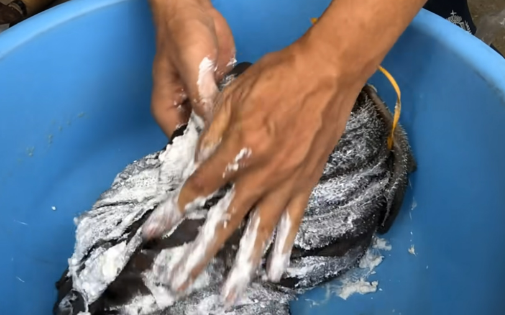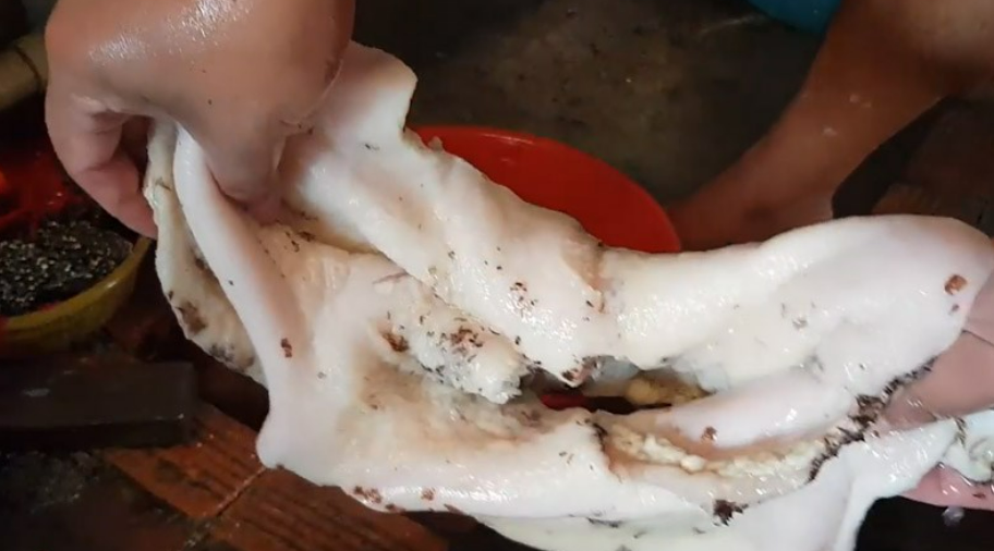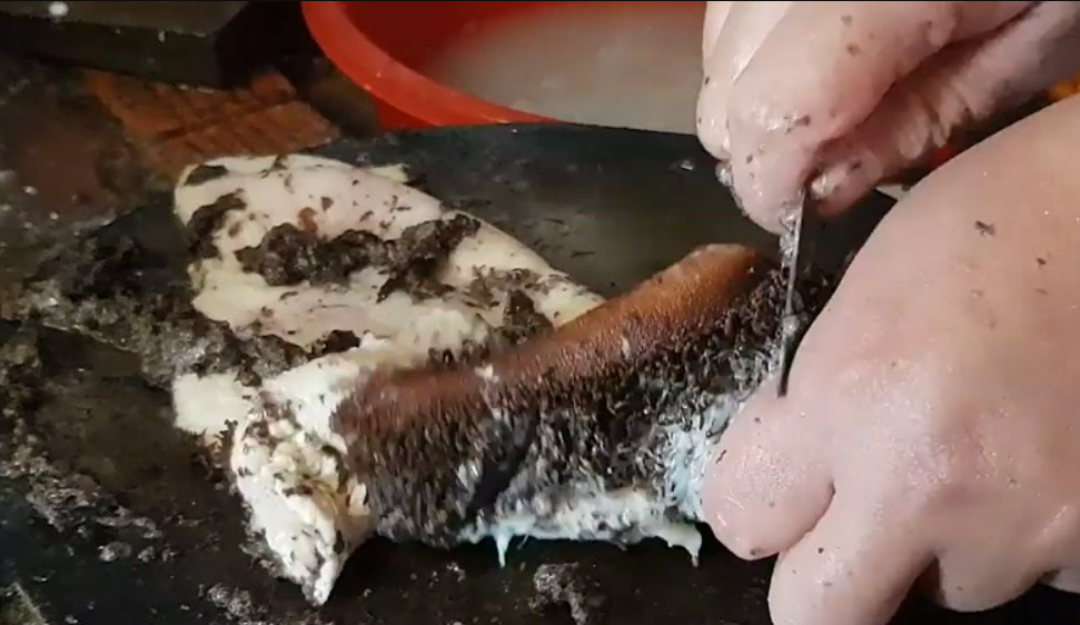 Tiếp tục dùng 1 nắm vôi ăn trầu chà xát lại một lần nữa, cạo hết phần màng đen và tạp chất còn sót lại rồi đem đi rửa sạch, để cho ráo.
