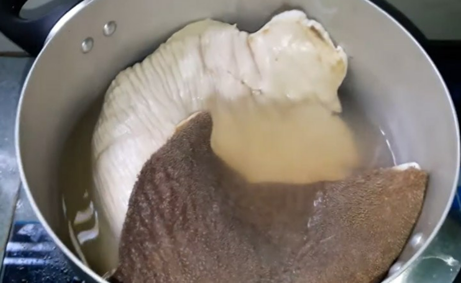 Bắc một nồi nước sôi lên bếp, sau đó bỏ sách bò vào chần trong khoảng 5 - 8 phút để lớp màng đen mềm ra, không còn dính chắc vào lá sách.