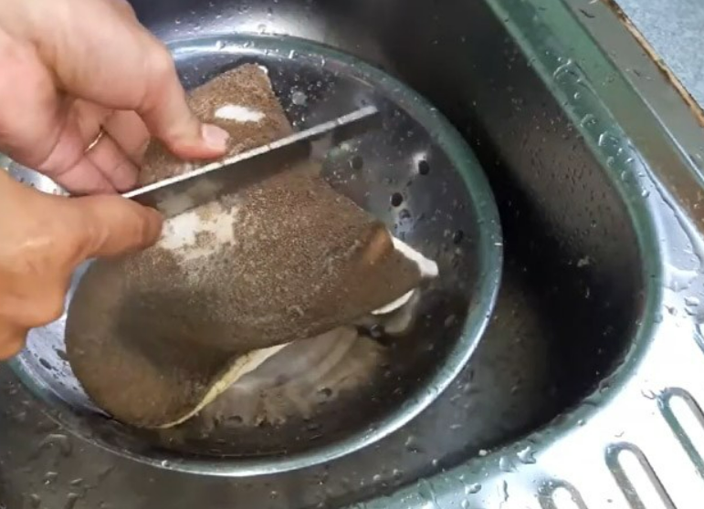 Cuối cùng lấy dạo cạo hết phần màng đen, chất bẩn đi rồi đem sách bò rửa lại với nước sạch.