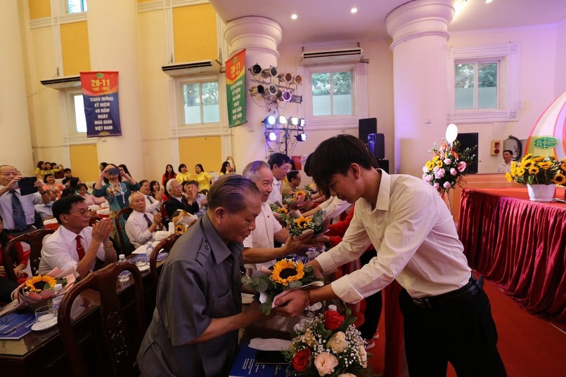 Các em sinh viên tặng hoa tri ân các thầy/ cô nhân kỷ niệm 40 năm ngày Nhà giáo Việt Nam. |