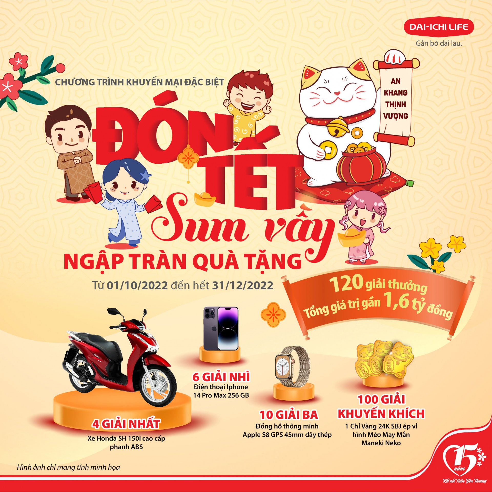 Tiếp nối chuỗi các chương trình tri ân khách hàng hấp dẫn, sôi động nhân dịp chào mừng 15 năm thành lập Dai-ichi Life Việt Nam (18/01/2007 – 18/01/2022), đồng thời đánh dấu mốc son kỷ niệm 120 năm thành lập Tập đoàn Dai-ichi Life (15/09/1902 – 15/09/2022), Dai-ichi Life Việt Nam triển khai chương trình khuyến mại đặc biệt trong Quý 4/2022 - “Đón Tết Sum Vầy, Ngập Tràn Quà Tặng”.