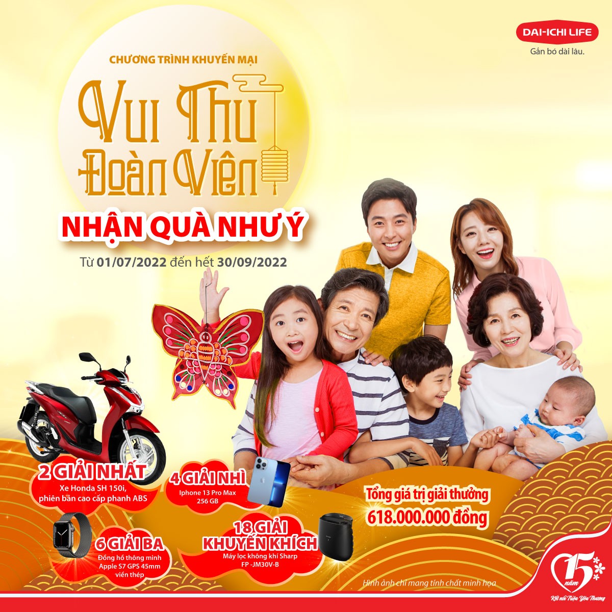 Chương trình khuyến mại “Vui Thu Đoàn Viên, Nhận Quà Như Ý” dành cho tất cả khách hàng của Dai-ichi Life Việt Nam trên toàn quốc có Hợp đồng Bảo hiểm được phát hành từ ngày 01/07/2022 đến hết ngày 30/09/2022 và đáp ứng đầy đủ các điều kiện của chương trình. Các giải thưởng với tổng trị giá hơn 600 triệu đồng bao gồm: