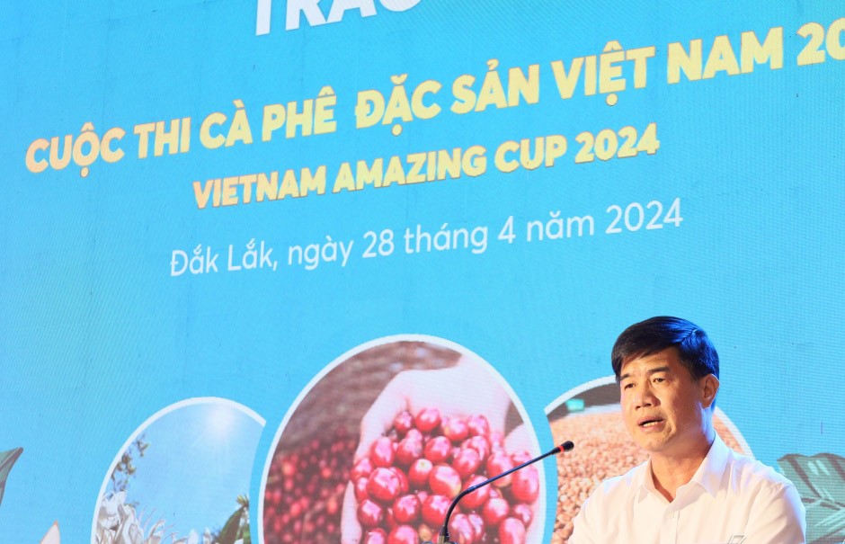 Phó Chủ tịch UBND tỉnh Nguyễn Thiên Văn biểu dương những kết quả xuất sắc của cuộc thi “Cà phê đặc sản Việt Nam 2024”.