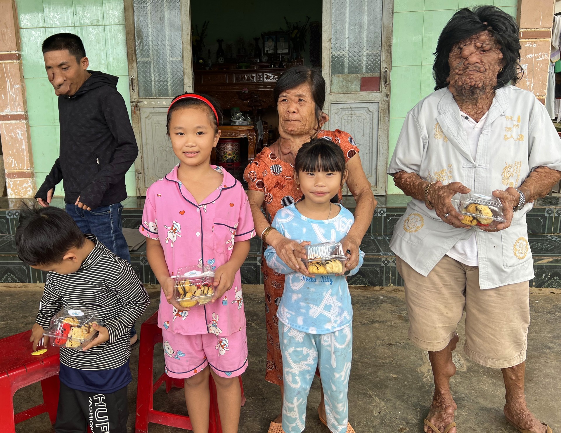 | Gia đình ông Tê nhận quà từ thiện chia cho trẻ em hàng xóm. |