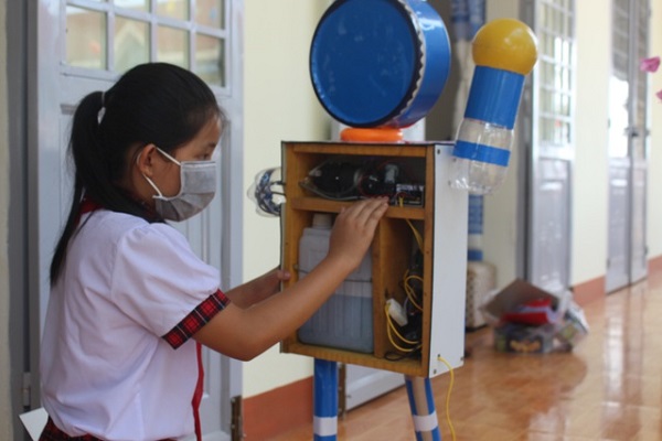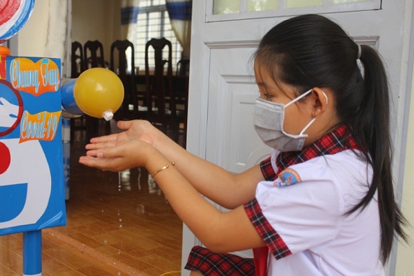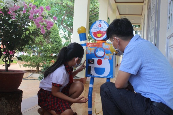 TH&SP Máy rửa tay sát khuẩn Doraemon là sản phẩm của em Phạm Thị Hoài An, học sinh lớp 4 ở tỉnh Đắk Nông. Sáng tạo độc đáo này sẽ tạo sự gần gũi, quen thuộc để học sinh tiểu học rửa tay thường xuyên.