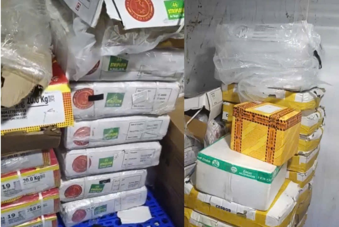 Qua đó phát hiện 2 kho lạnh chứa 1.008kg hàng hóa là thực phẩm đông lạnh các loại chân gà, mỡ heo, xương bò, xương heo, tim heo, bắp bò... được đựng trong các thùng cát tông có chữ nước ngoài và một số bao bì không có nhãn mác thể hiện thông tin về nguồn gốc xuất xứ.