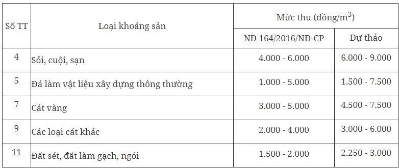Do vậy, để hạn chế khai thác manh mún, nhỏ lẻ, kém hiệu quả; khuyến khích sử dụng vật liệu khác thay thế khoáng sản làm vật liệu xây dựng thông thường; bảo đảm cho địa phương linh hoạt trong điều chỉnh mức thu phí, hạn chế ảnh hưởng đến giá vật liệu xây dựng trong bối cảnh dịch COVID-19, ảnh hưởng đến thực hiện các dự án đầu tư hạ tầng; Bộ Tài chính trình Chính phủ điều chỉnh tăng khung mức phí đối với khoáng sản làm vật liệu xây dựng thông thường theo hướng: Tăng 150% mức phí tối thiểu và mức phí tối đa tại Nghị định 164/2016/NĐ-CP như sau: