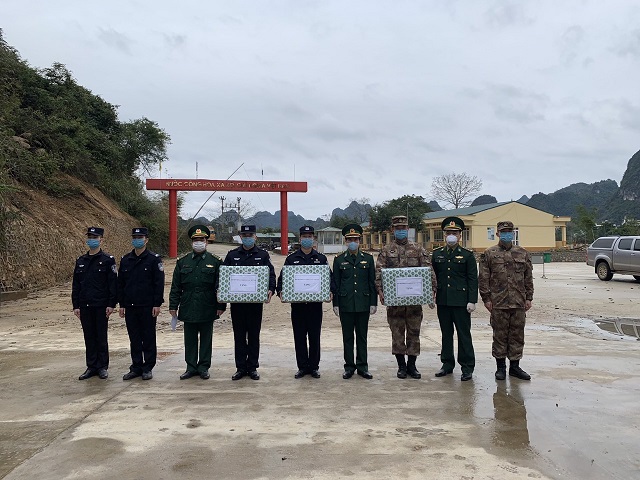 Cán bộ chiến sĩ biên phòng Việt Nam trao quà cho biên phòng Trung Quốc