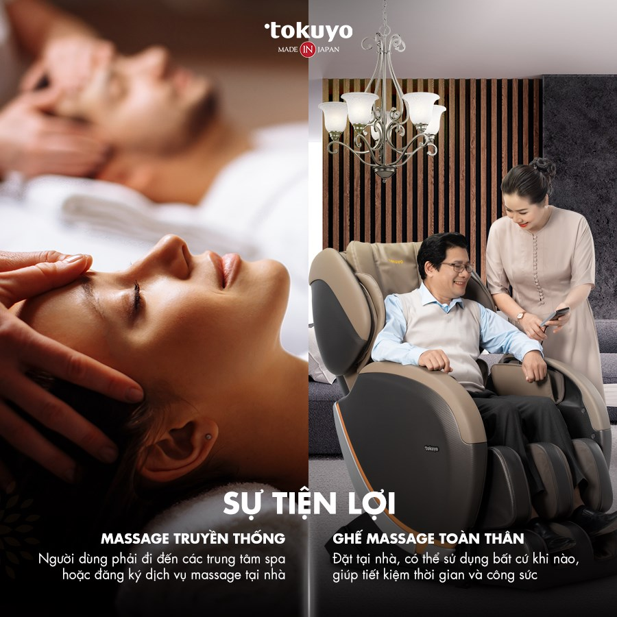 Nếu như với hình thức massage truyền thống, bạn sẽ mất thời gian di chuyển để đi đến các trung tâm massage, spa. Thì với ghế massage toàn thân, bạn có thể sử dụng ngay tại nhà ở bất cứ khi nào. Việc này giúp tiết kiệm thời gian và công sức, đặc biệt với những người bận rộn, không có nhiều thời gian; người già, người cao tuổi đi lại khó khăn.