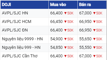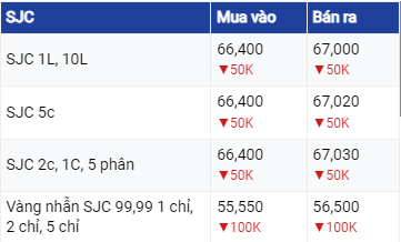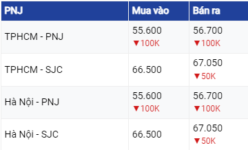 Theo đó, giá mua và giá bán cùng giảm 50.000 đồng/lượng tại Công ty Vàng bạc Đá quý Sài Gòn. Hiện tại, giá trần mua vào của vàng SJC đạt mốc 66,4 triệu đồng/lượng và giá trần bán ra có ngưỡng 67,00 triệu đồng/lượng.