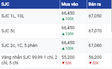 Công ty vàng bạc đá quý Sài Gòn niêm yết giá vàng SJC ở mức 66,45 triệu đồng/lượng mua vào và 67,07 triệu đồng/ lượng bán ra.