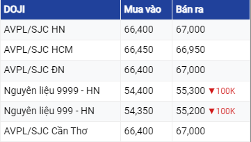 Tập đoàn Doji niêm yết giá vàng SJC ở mức 66,40 triệu đồng/ lượng mua vào và 67,00 triệu đồng/ lượng bán ra.