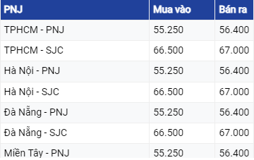 Hệ thống PNJ niêm yết giá vàng SJC ở mức 66, 50 triệu đồng/ lượng mua vào và 67,000 triệu đồng/ lượng bán ra.