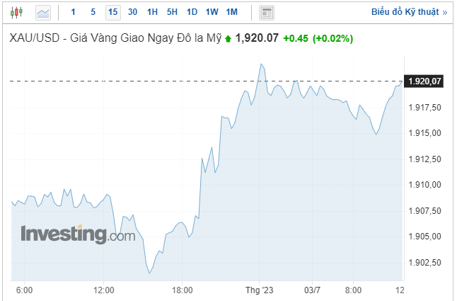 Theo dữ liệu từ Kitco tính đến 12h00 ngày 3/7/2023 (theo giờ Việt Nam), giá vàng thế giới đang ở mức 1,920,07 USD/ounce quy đổi theo tỷ giá Vietcombank chưa tính thuế phí, mức giá này tương đương 54,8 triệu đồng/lượng.
