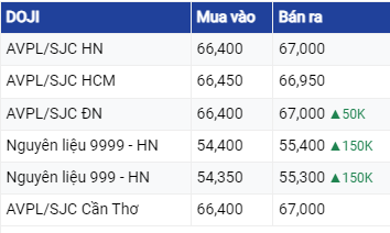 Giá vàng thương hiệu DOJI tại khu vực Hà Nội đang niêm yết ở mức 66,4 triệu đồng/lượng mua vào và 67 triệu đồng/lượng bán ra. Tại TP Hồ Chí Minh, vàng thương hiệu này đang mua vào mức tương tự nhưng bán ra thấp hơn 50.000 đồng so với khu vực Hà Nội.