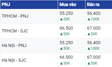 Vàng PNJ đang mua vào ở mức 66,50 triệu đồng/ lượng và bán ra mức 67,00 triệu đồng/ lượng, tăng 50.000 đồng ở 2 chiều so với ngày trước đó.