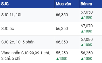 Giá vàng SJC ở khu vực Hà Nội và Đà Nẵng đang mua vào mức 66,35 triệu đồng/lượng và bán ra mức 67,05 triệu đồng/lượng. Tại TP Hồ Chí Minh, vàng SJC vẫn đang mua vào mức tương tự như ở khu vực Hà Nội và Đà Nẵng nhưng bán ra cao hơn 20.000 đồng. Như vậy, so với rạng sáng ngày trước đó, vàng miếng SJC đã được điều chỉnh tăng 100.000 đồng ở chiều bán ra.